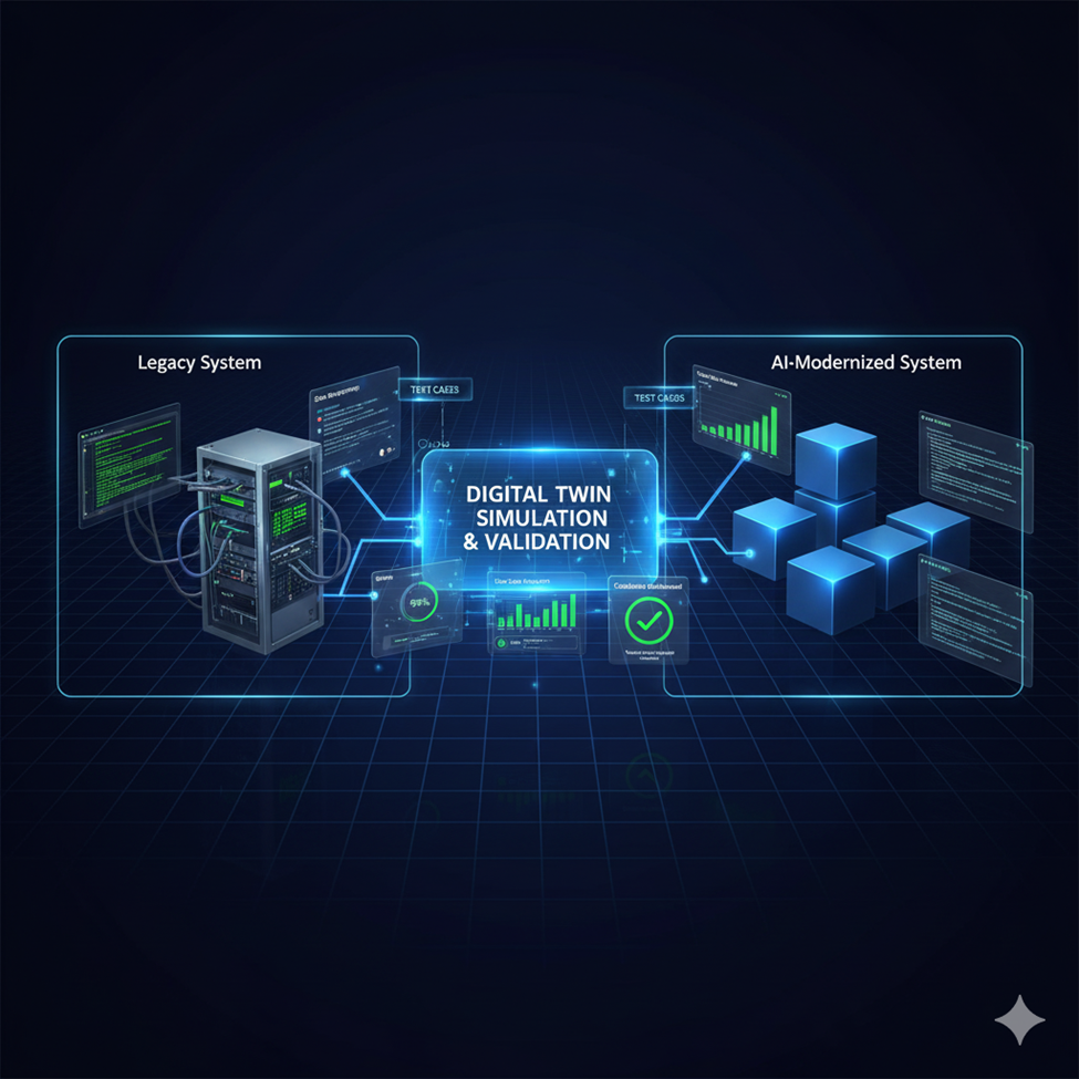 The GenAI Solution: Test Case and Harness Generation: GenAI accelerates quality assurance by analyzing the legacy system’s actual execution patterns and code structure. It then automatically generates a comprehensive suite of high-coverage unit, integration, and end-to-end test cases. Furthermore, advanced methodologies leverage GenAI to create a high-fidelity "Digital Twin" of the old system. This allows for rigorous, low-risk simulation and dual-run validation of the new system against the old before the final operational cutover.